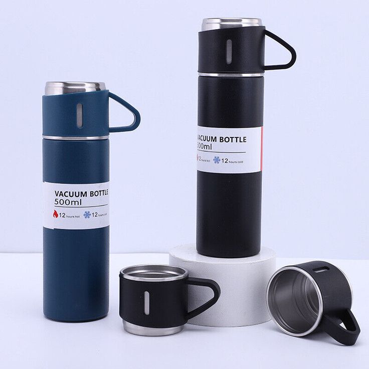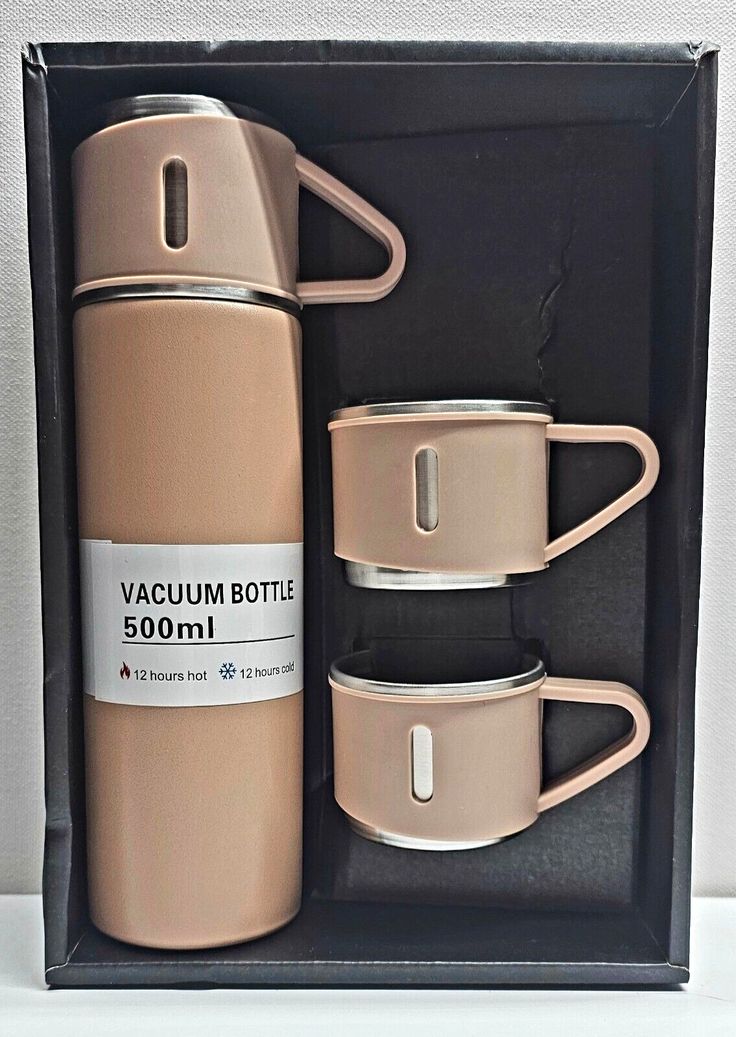 Keep drinks hot or cold with this high-quality stainless steel vacuum flask set. Includes 500ml double-wall flask and 3 cups, perfect as a gift set for home, office, or travel. Durable, leak-proof, and stylish.
