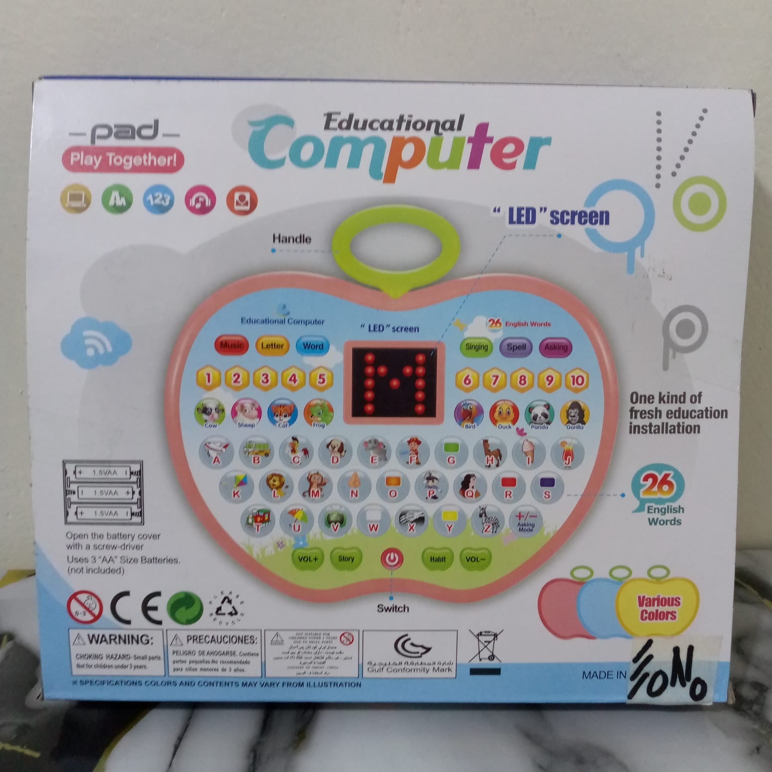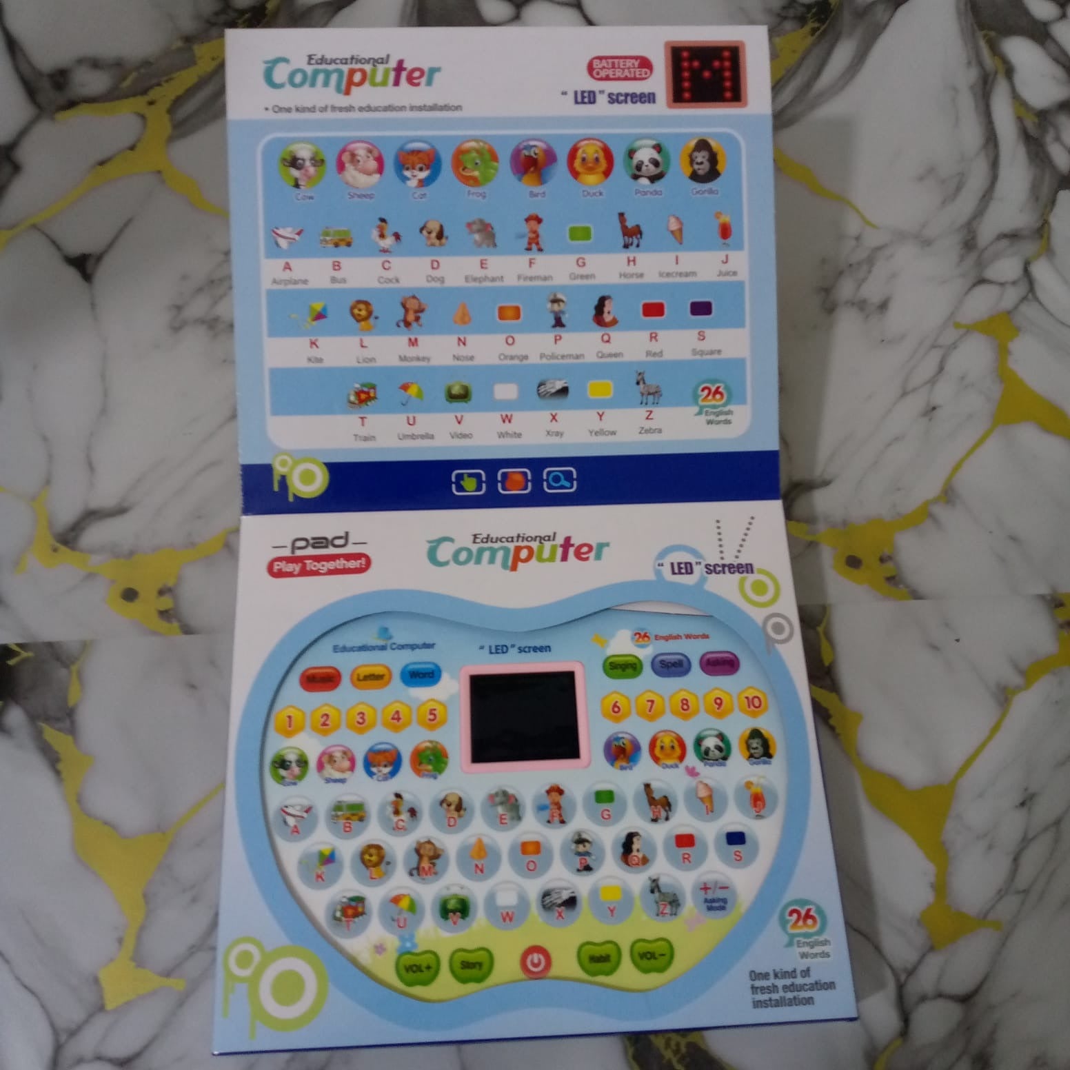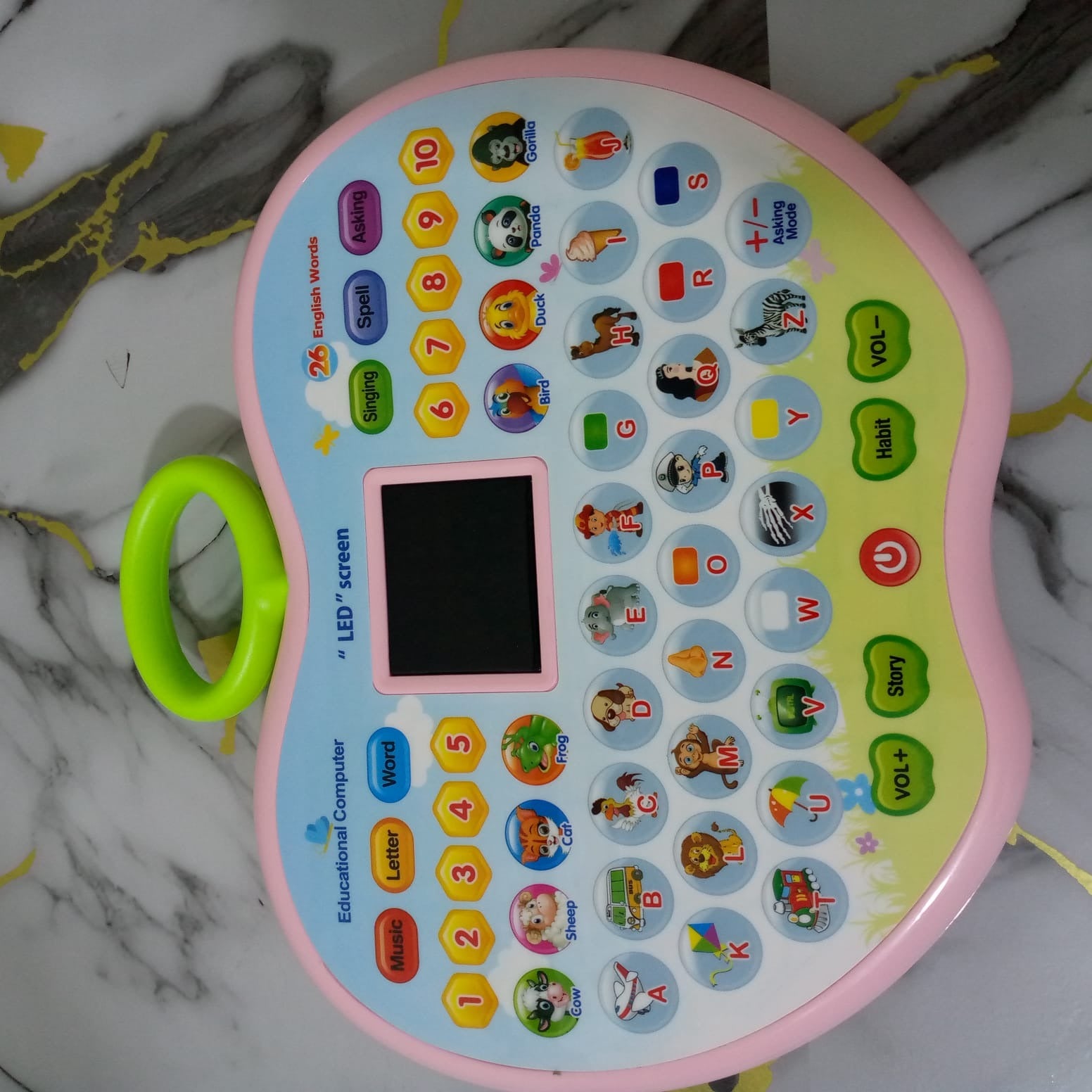 This LED learning laptop helps children aged 3 and up learn alphabets, numbers, words, and spelling through fun quizzes and music. It is colorful, lightweight, and easy for little hands to use, making learning enjoyable and interactive.
